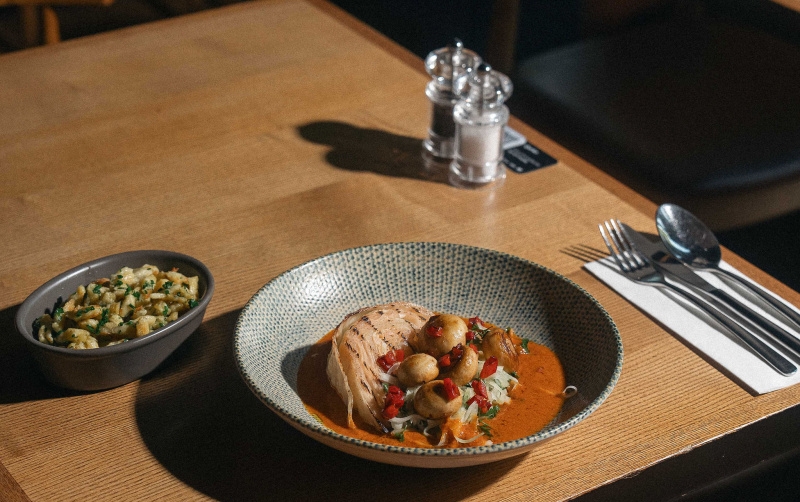 Vegetariánská varianta, která neurazí ani masožravce. Pečené mladé zelí, zelný salát s kerblíkem, orestované baby žampiony se sladkou červenou paprikou – to vše propojuje omáčka z uzené papriky, která talíři dodá jemný kouřový nádech. Jako příloha přichází bylinkové špecle opečené na másle, s pažitkou.