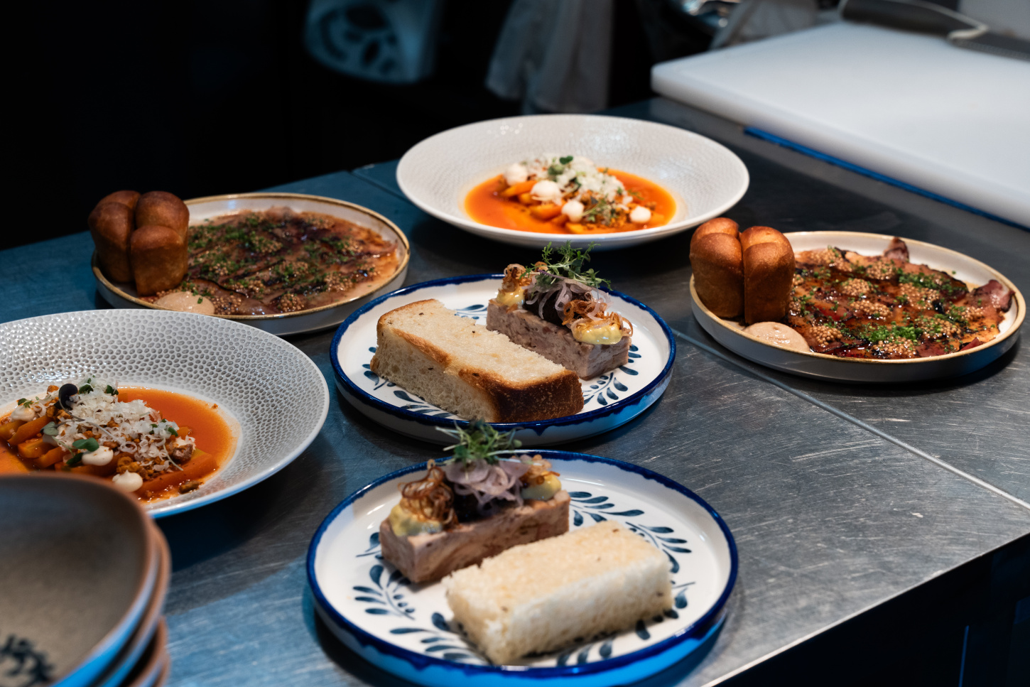Interiér restaurace pracuje s kontrastem dřeva, betonu a industriálních prvků. Prostor má působit živě a přirozeně – stejně jako kuchyně samotná.